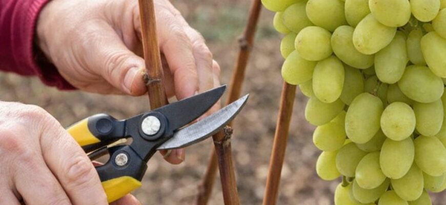 До початку активного росту винограду необхідно провести обрізку. Видаліть усі сухі, пошкоджені або хворі лози. Також варто прибрати занадто довгі пагони та ті, що переплітаються або заважають один одному.