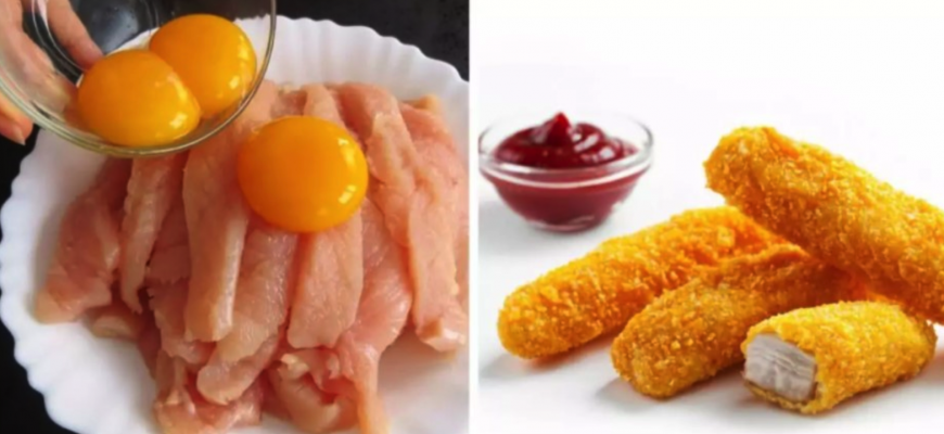 Беремо курячу грудку, залuваємо її яйцями, і готуємо найніжніші палички в паніровці