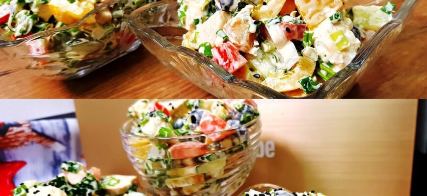 Салат з курки, солодкого перцю, сиру фета, огірків і помідорів. Виходить ситно, смачно та оригінально. Інгредієнти: курка, 300 г; фета, 200 г;