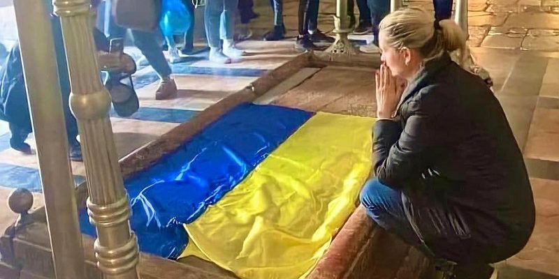 Ігумен Саватій Собко Український прапор у храмі Гробу Господнього в Єрусалимі. Він лежить на плиті, на яку був покладений Христос, знятий з хреста, і на