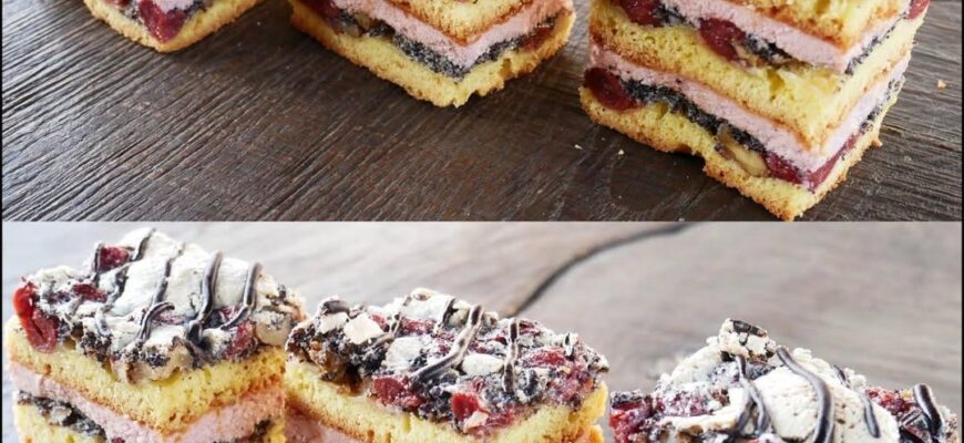 Ніжне Пісочне тісто з вишнями і горіхами, хрустке Макове безе і Вишневий крем – ідеальне поєднання смаків. Він стане фаворитом на Вашому столі.