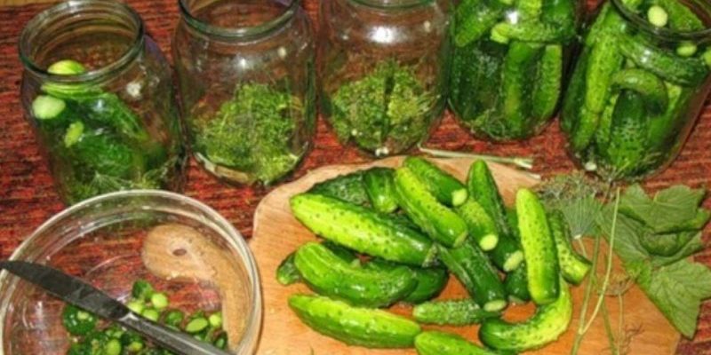 Огірки закладаємо тісненько огірками. Заливаємо в перший раз огірки окропом і залишаємо на 10 хвилин постояти, зливаємо воду в раковину.