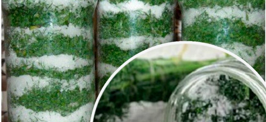 2. Дрібно наріжте зелень і укладайте в стерилізовані банки шарами, чергуючи кріп з сіллю.
