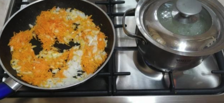 Картопля я спочатку варю цілою, а після мну, оскільки мені подобається суп-пюре. Пасерую цибулю і моркву.