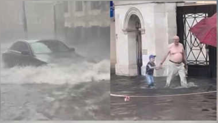 Люди пересуваються по коліна у воді, а машини радше “пливуть”, аніж їдуть. Вулицями навіть плавають чиїсь столи.
