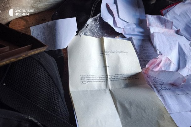 В обгорілому житлі знайшли документи російською мовою. На кадрах видно заяви від нападника про те, що йому погрожував фізичною розправою сусід.
