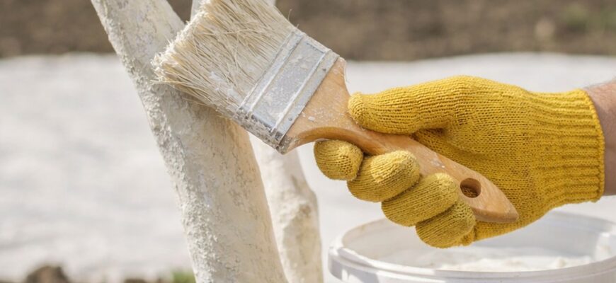 Перед побілкою потрібно очистити кору від моху, лишайників і бруду. Роботи не варто проводити в холодну або дощову погоду. Обов’язково використовуйте рукавички та захисні окуляри.