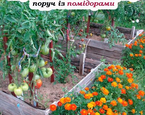 Плануйте посадку так, щоб чорнобривці були по краях грядки або між кущами помідорів.
