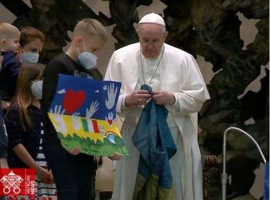Папа Римский розповів, що український прапор йому привезли саме з Бучі: «Цей прапор прибув з війни, саме з цього багатостраждального міста Бучі. І тут є також кілька українських дітей, які тепер тут разом з нами. Привітаймо їх та молімося разом за них».