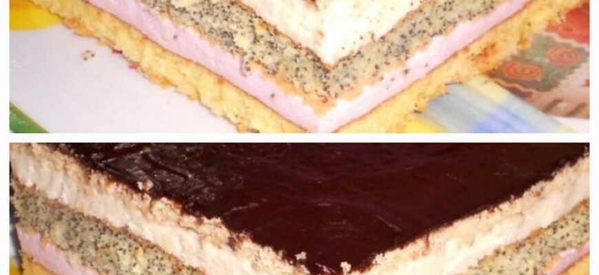 На бісквіт викладаємо вершковий крем, розрівнюємо. Зверху на вершковий крем викладаємо маковий корж, змащуємо заварним кремом, вирівнюємо. Печиво змочуємо в ромі, викладаємо на заварний крем. Поливаємо глазур’ю.