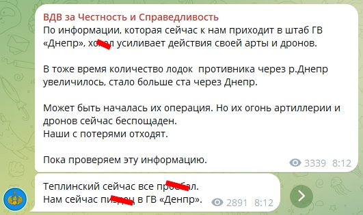 “За інформацією, яка зараз до нас приходить до штабу ГВ “Дніпро”, х***л (українці – ред.) посилює дії своєї арти та дронів… Кількість човнів противника (…) збільшилася, побільшало ста через Дніпро. Можливо, почалася їхня операція. Але їхній вогонь артилерії та дронів зараз нещадний. Наші із втратами відходять“, – написав російський Z-канал.