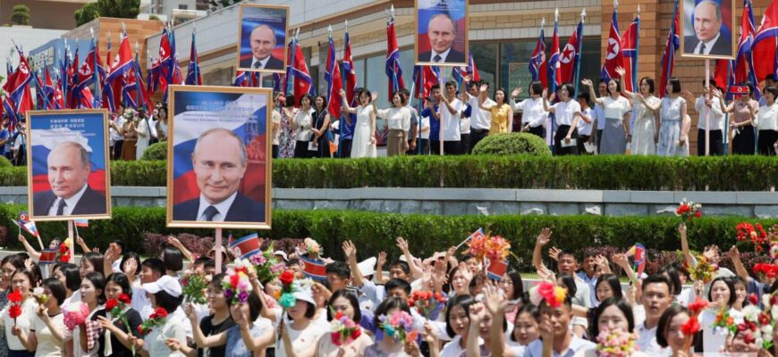 Російського диктатора зустріли з оркестром, банерами та натовпом. Путін заявив про “новий фундаментальний документ” з Північною Кореєю. Кім Чен Ин натомість сказав, що відносини двох країн “вступають у період нового розквіту”