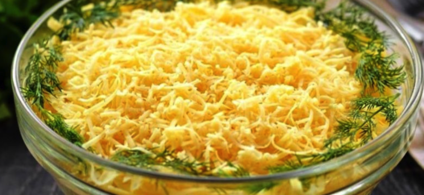 При сервіруванні натираємо на верхівку салату сир на великій тертці. Також прикрашаємо салат гілочками кропу.
