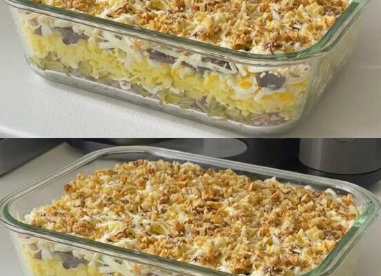 - Шостий шар – тертий сир. Зверху посипте подрібненими волоськими горіхами.