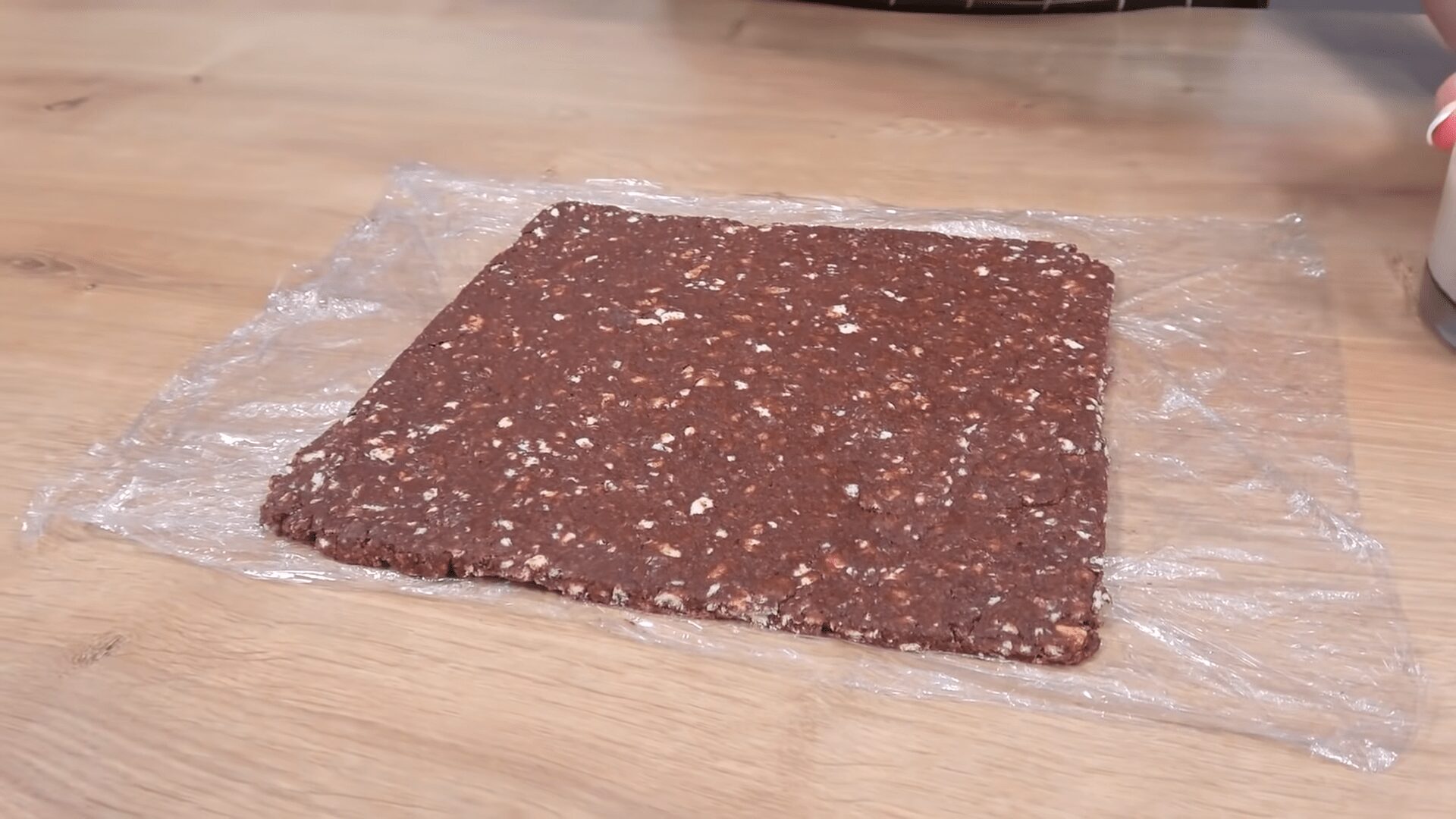 “Тісто” з крихти та бананового пюре викладаємо на плівку і за допомогою качалки розкачуємо його у квадратний пласт, товщиною приблизно 5 мм. Нерівності зрізаємо.