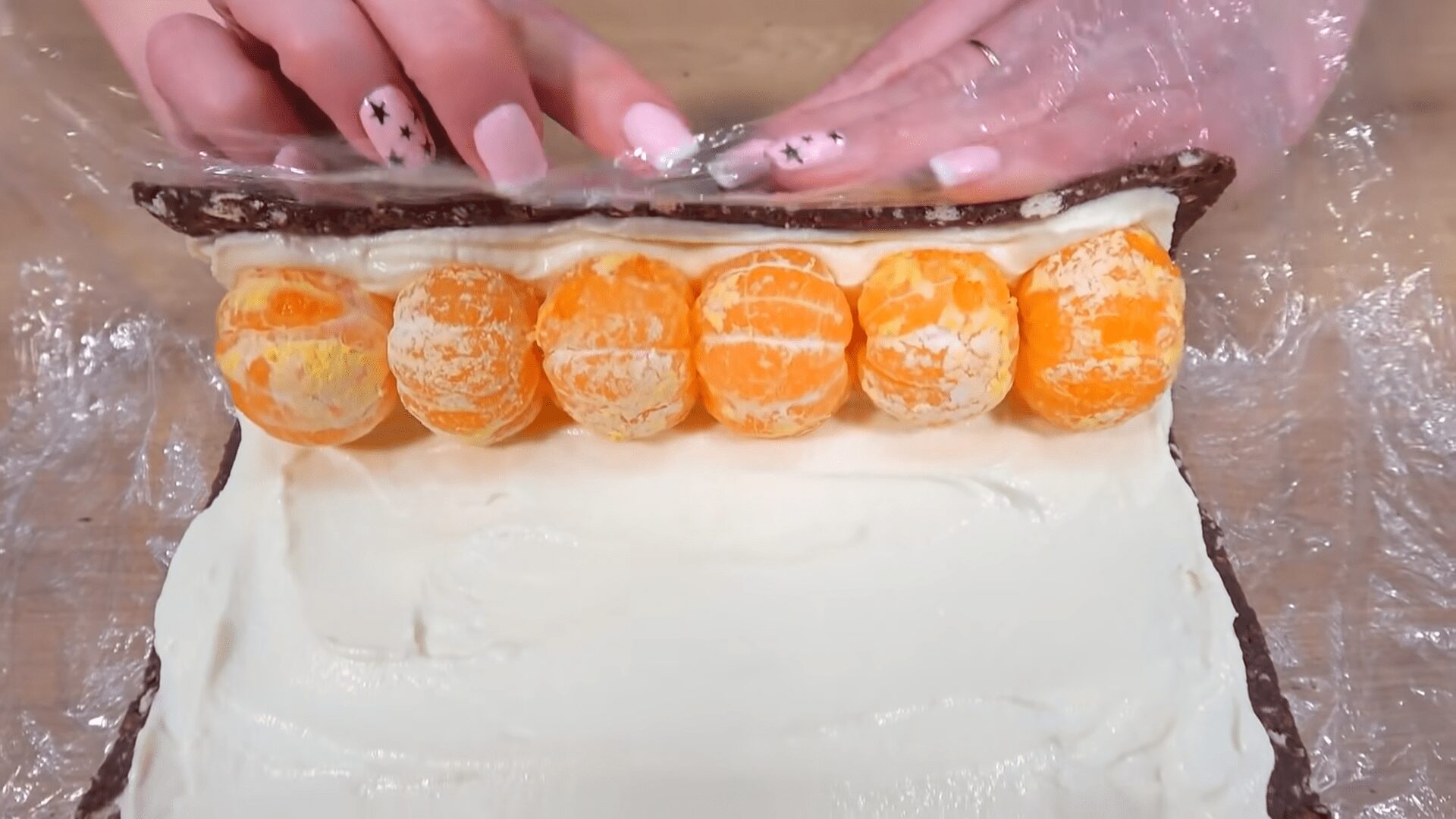 Мандарини очищаємо і викладаємо на край заготовки. За допомогою плівки закручуємо все у щільний рулет.