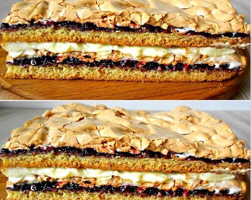 7. Дістати з духовки форму для запікання. На корж нанести густий чорносмородиновий джем, рівномірно розподіляючи по всій площі. Далі варто нанести збиті білки і посипати нарізаними волоськими горіхами.