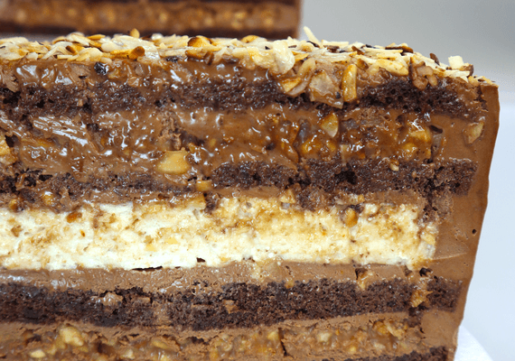 - Вийміть торт з роз’ємної форми, полийте розтопленим маслом з шоколадом та обсипте з усіх боків смаженим арахісом.