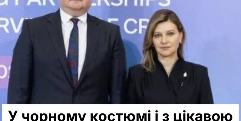 На конференції Зеленська постала у діловому образі. На ній був чорний костюм, який складався з жакета на затин і з коміром-стійкою та широких штанів. Талію вона підкреслила ремінцем-шнурівкою.
