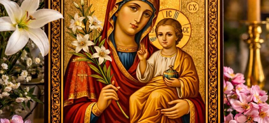 На іконі зображена Діва Марія з маленьким Ісусом, у руках вона тримає лілії. За переказами, саме архангел Гавриїл приніс Марії благу звістку разом із цими квітами. Лілії можуть бути різного кольору — білого чи рожевого — але їхній сенс незмінний: вони символізують чистоту, духовність і непорочність.
