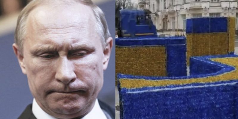 Відповідне відео вже розлетілось мережею. Так, синьо-жовту конструкцію встановили у центрі російського міста.