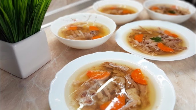 11. Приготуйте лотки для страви, розкладіть м’ясо та овочі й розлийте бульйон в кожний лоток.