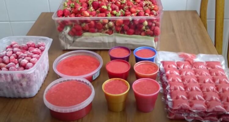 Під час перебування в морозилці втрачається частина натуральної солодкості, тому варіант заморожування методом пюре з цукром найбільш практичний. Його використовують для додавання в десерти чи соуси. Перебийте 1 кг полуниці блендером та додайте цукор. Збийте до однорідності, покладіть в пластиковий контейнер та відправте в морозилку.