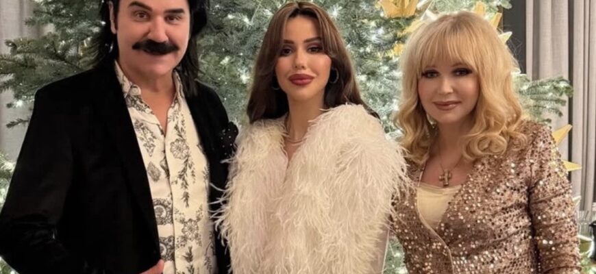 Вони у красивих образах позували на тлі новорічної ялинки. Співак був одягнений у чорний костюм і білу сорочку з принтом. Його дружина сяяла у сукні кольору айворі і подовженому темно-бежевому жакеті з блискітками. А на доньці був стильний білий костюм із пір’ям.