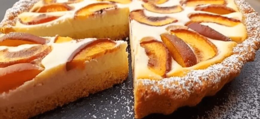 Тепер дістаньте тісто з холодильника і рівномірно розкачайте його за розміром форми (25 см), після чого викладіть в неї, утворюючи бортики. Далі першим шаром покладіть сирну начинку, рівномірно розподіляючи її по всій поверхні, а зверху красиво розташуйте нарізані персики, формуючи візерунок або просто розкладаючи їх у довільному порядку.