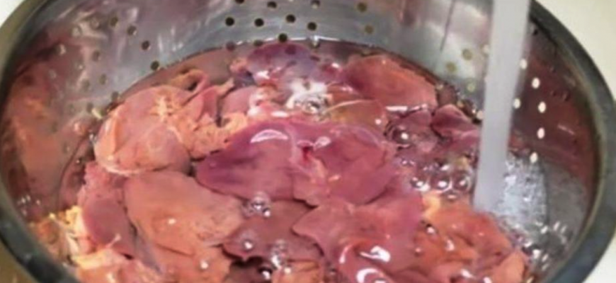 1. Ріжемо печінку порційними шматочками і заливаємо окропом на 2 – 3 хвилини. Заливши окропом, ми отримує печінку більш м’яку і без неприємного запаху, ніж при замочуванні в молоці.