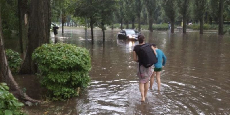 У Києві залпова злива накоїла лиха: людей буквально зносило потоками води, пошкоджено деякі дороги.