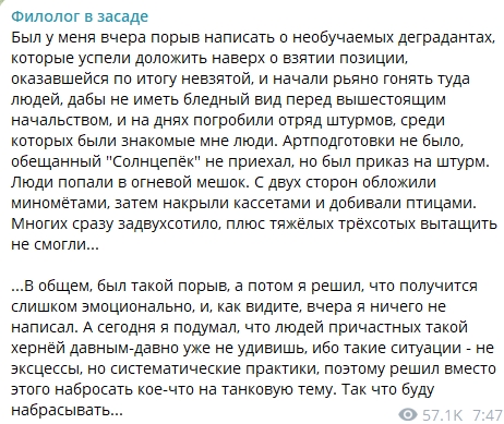 “Днями поховали загін штурмів… Артпідготовки не було, обіцяний “Сонцепек” не приїхав, але був наказ на штурм. Люди потрапили у вогневий мішок. З двох сторін обклали мінометами, потім накрили “касетами” (касетними боєприпасами – ред.) та добивали “птахами” (безпілотниками – ред.). Багатьох одразу задвохсотило (убило – ред.), плюс важких трьохсот (поранених – ред.) витягнути не змогли“, – розповів Z-блогер.